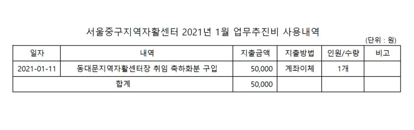 서울중구지역자활센터 2021년 1월 업무추진비 사용내역 페이지 정보 작성자 서울중구지역자활센터 댓글 0건 조회 5,607회 작성일 21-02-03 17:27 목록 본문 서울중구지역자활센터 2021년 1월 업무추진비 사용내역 이전글에스이임파워 사회적협동조합 '2021년 사회적기업가 육성사업' 창업팀 모집 안내 21.02.08 다음글센터 예산 및 결산 제공지 21.02.02 댓글 0 댓글목록 등록된 댓글이 없습니다.