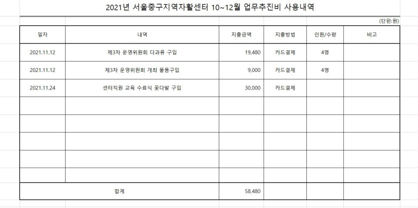 2021년 서울중구지역자활센터 10월~12월 업무추진비 사용내역 페이지 정보 작성자 서울중구지역자활센터 댓글 0건 조회 4,997회 작성일 21-12-16 18:48 목록 본문 . 이전글서울중구지역자활센터 2021년 결산공지 22.01.27 다음글2021년 서울중구지역자활센터 7월~9월 업무추진비 사용내역 21.12.16 댓글 0 댓글목록 등록된 댓글이 없습니다.