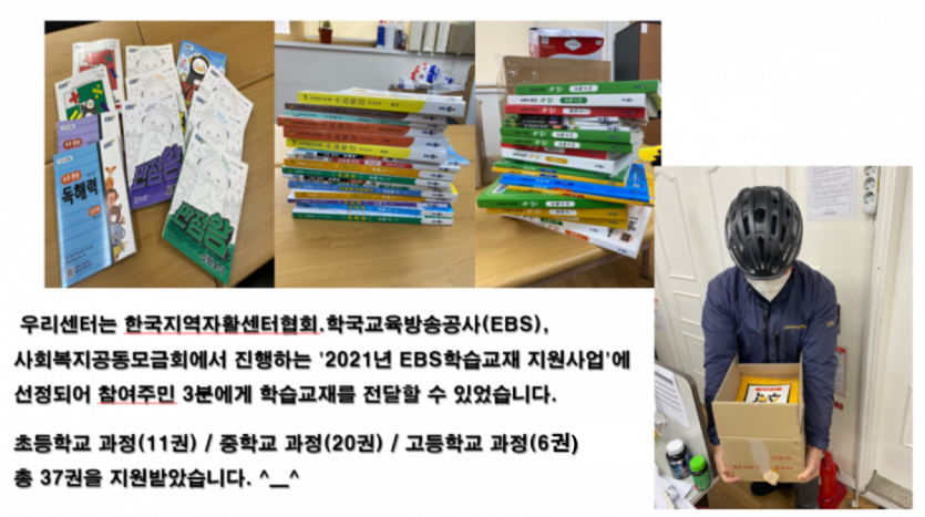 2021년 상반기 EBS 학습교재 지원 선정 페이지 정보 작성자 서울중구지역자활센터 댓글 0건 조회 6,019회 작성일 21-05-21 16:15 목록 본문 - 이전글서울중구지역자활센터 비전 컨설팅 진행 완료 21.05.21 다음글서울자활소식 "희망메아리" 3월호 21.03.30 댓글 0 댓글목록 등록된 댓글이 없습니다.