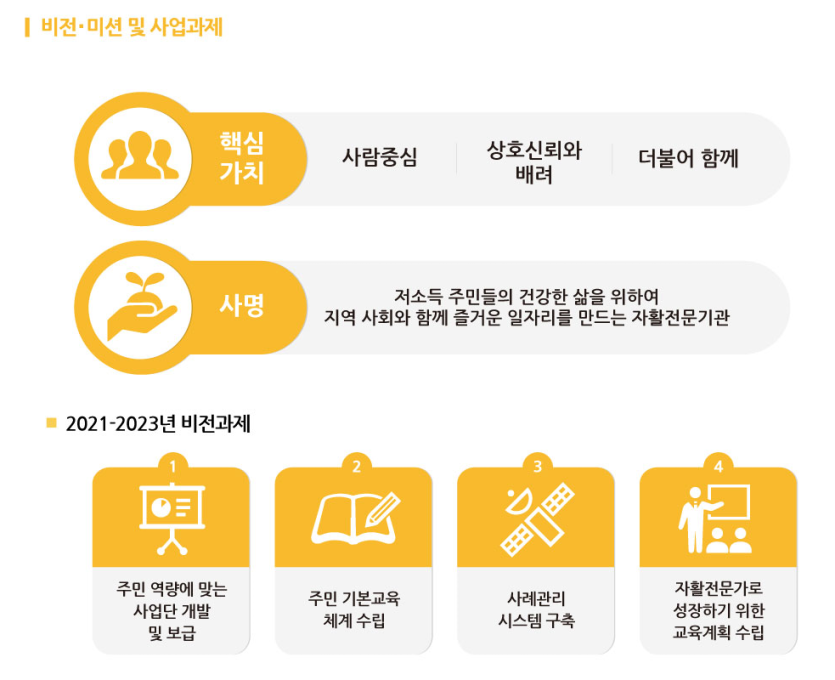 2021년 ~ 2023년 까지 "저소득주민의 건강한 삶을 위하여 지역사회와 함께 즐거운 일자리를 만드는 자활전문기관"이라는 사명과